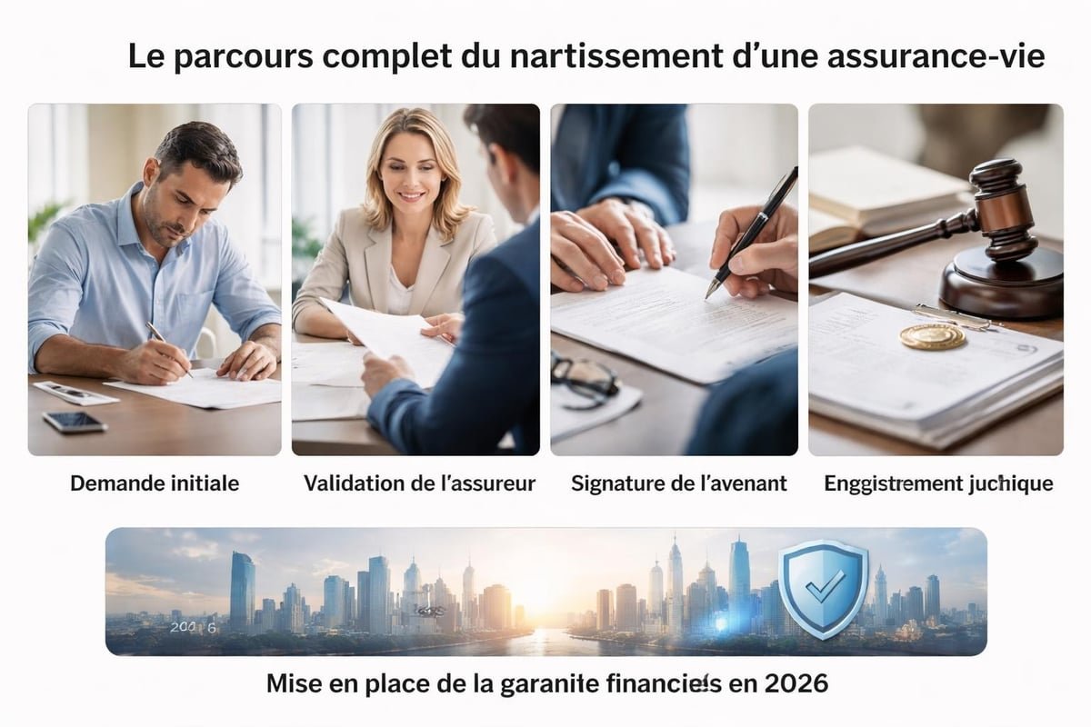 Le processus implique plusieurs étapes administratives. Le souscripteur informe l'assureur de son intention de nantir le contrat. L'établissement prêteur et l'assureur signent un avenant au contrat. Le nantissement est ensuite enregistré pour garantir l'opposabilité aux tiers.