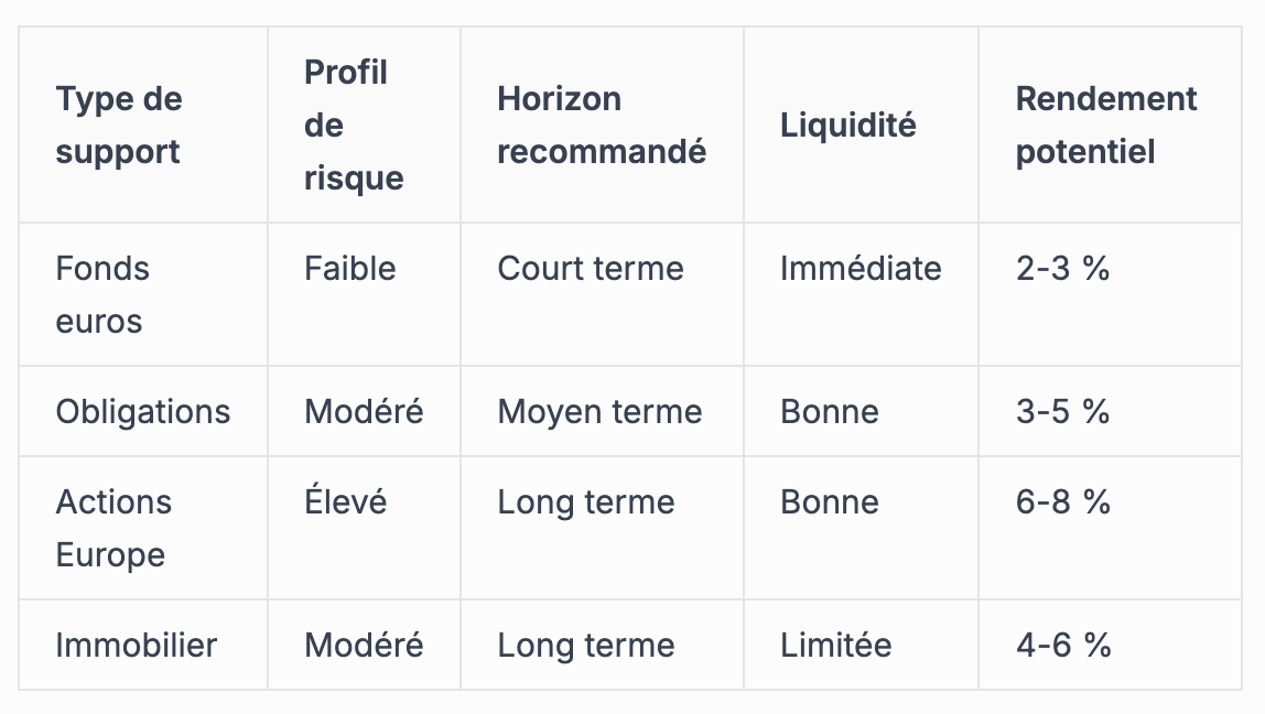 Les supports disponibles se sont considérablement diversifiés. Au-delà des traditionnels fonds euros et OPCVM actions-obligations, les contrats modernes intègrent des trackers, des fonds immobiliers, des private equity et même des thématiques ESG spécialisées.