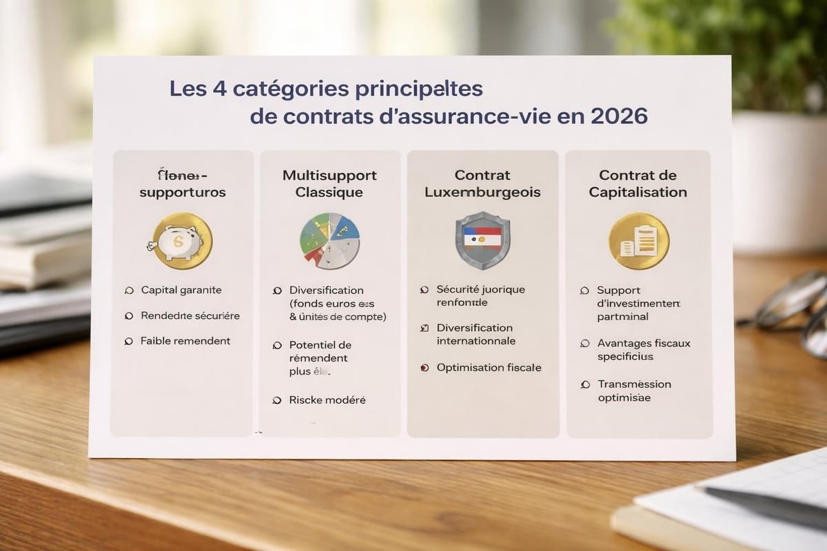 Le marché propose différentes catégories de contrats AV adaptés à des profils variés. Les contrats en euros offrent une garantie du capital avec un rendement modéré mais sécurisé. Les contrats multisupports combinent fonds euros et unités de compte pour diversifier l'allocation.