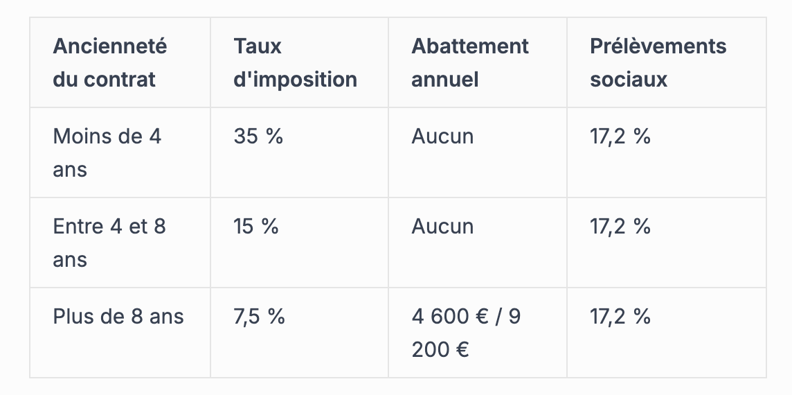 Après huit ans de détention, le contrat AV offre des avantages fiscaux significatifs. Les gains bénéficient d'un abattement annuel de 4 600 € pour une personne seule et 9 200 € pour un couple. Au-delà de ces seuils, le taux d'imposition s'établit à 7,5 % pour les versements inférieurs à 150 000 €.