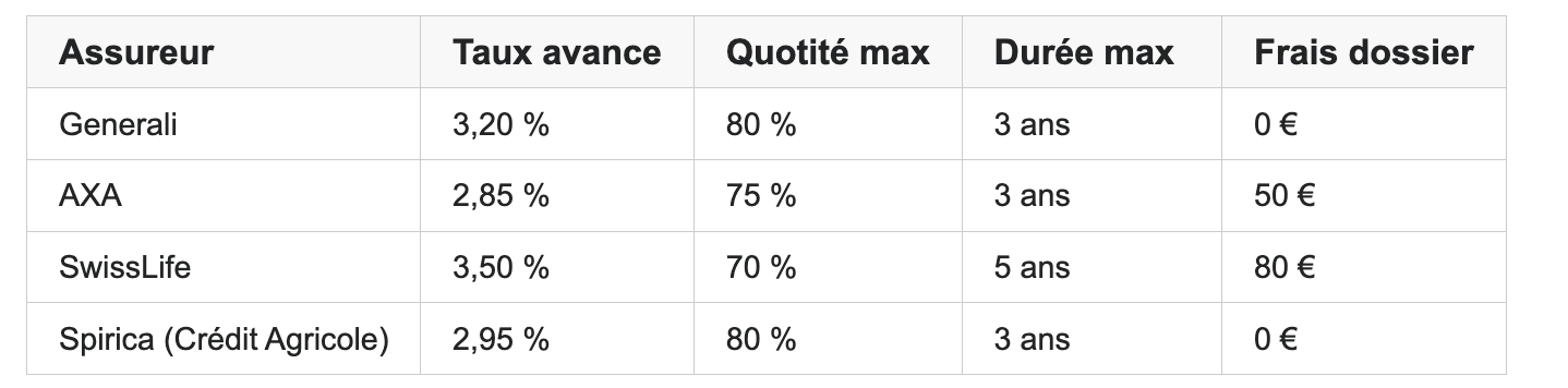 Montant maximum : 60 à 80 % de la valeur de rachat (selon assureurs)