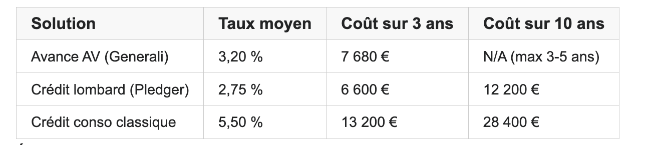 Écart avance vs crédit lombard sur 3 ans : +1 080 € plus cher avec l'avance
