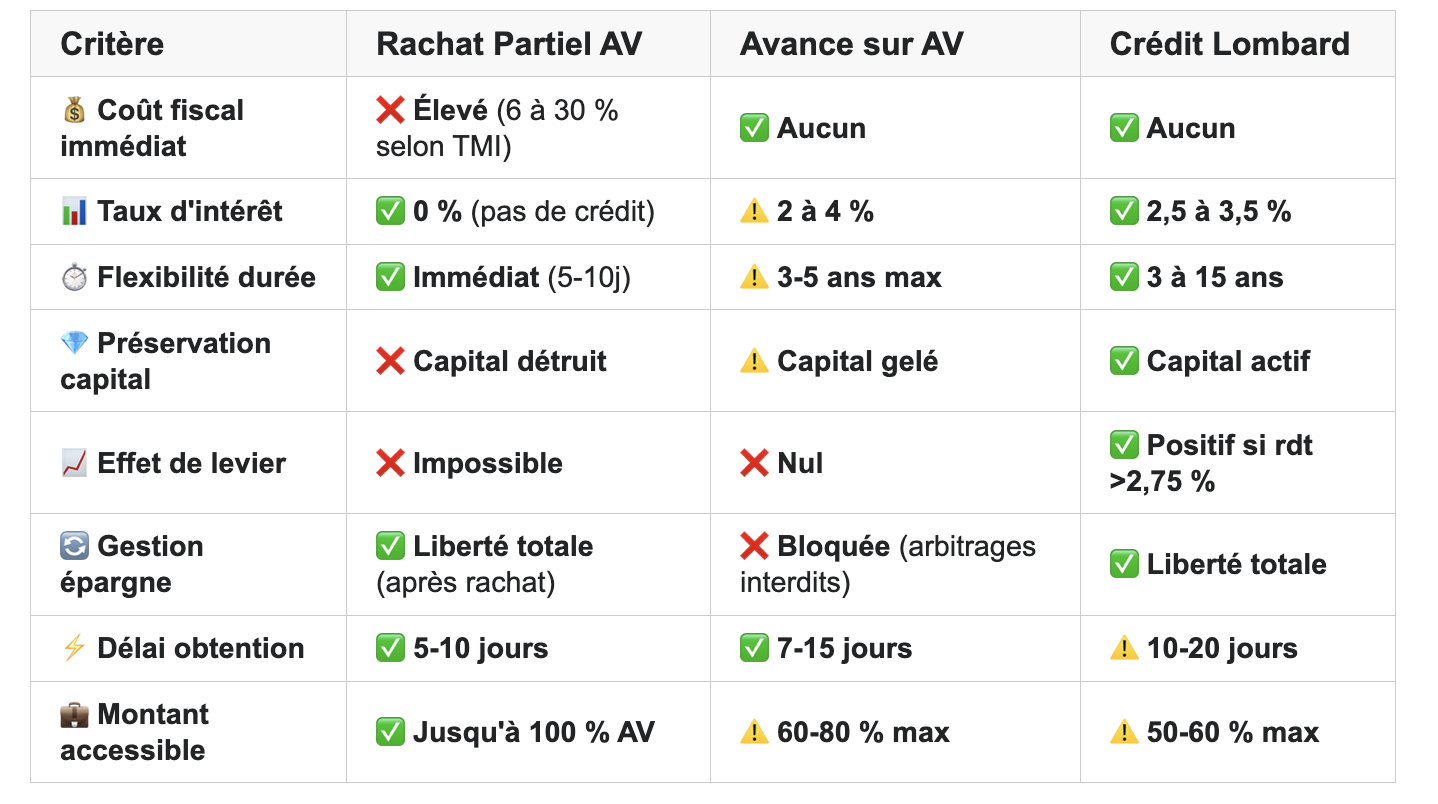 Le rachat partiel "coûte 0 € d'intérêts" mais perd 6-30 % en fiscalité + gains futurs. Le crédit lombard "coûte 2,75 % d'intérêts" mais génère 4-6 % de rendement parallèle. Raisonnez en coût d'opportunité.