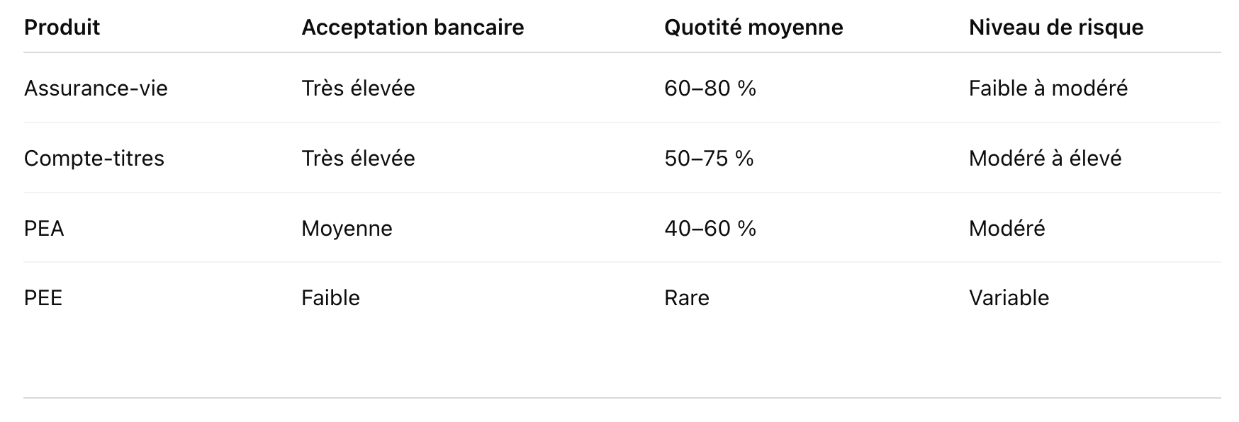 Mais tous les produits d’épargne ne sont pas acceptés de la même manière par les banques. Entre PEA, PEE, assurance-vie et comptes-titres, les règles varient selon la liquidité, la fiscalité et le niveau de risque des placements.